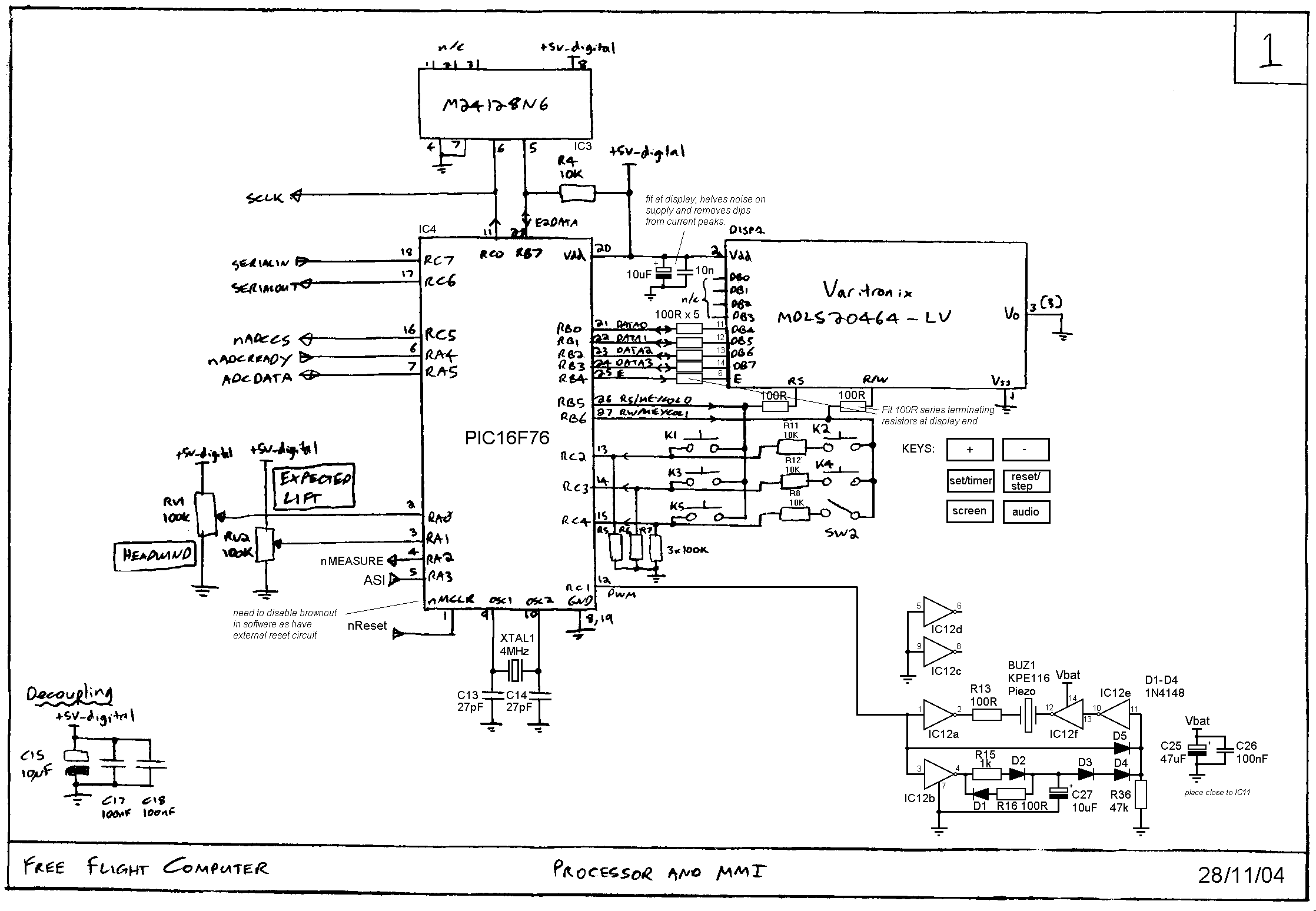 LCDThe LCD module is a 20 x 4 type with contrast tied to 0V. You could improve this by having a negative voltage generator but this would give you more noise in the ADC reads. With the specified module there is no problem reading it when contrast is as currently set.Finally, the interface to the LCD module is terminated with some series resistors to reduce overshoot by the signal edges. The ground and power supply are also several strands of ribbon cable in order to avoid noise on supplies when the module is being written to.