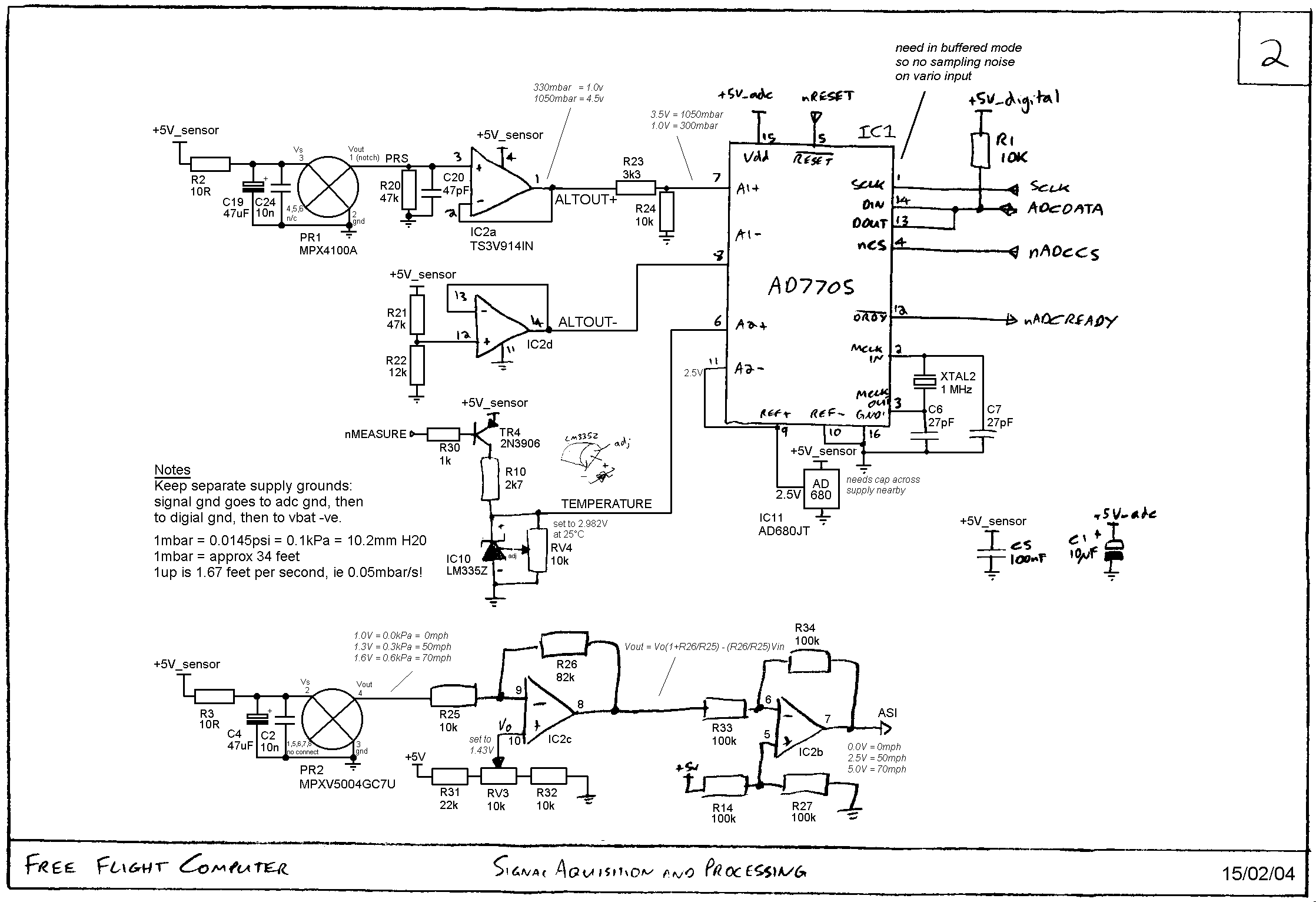 Pressure sensor and signal conditioningThe main pressure sensor is a Motorola MPX4100A and makes life really easy. It is linear and temperature compensated from 200 mbar (0.5V) up to and beyond 1000 mbar (4.5V). Consequently it is capable of being directly interfaced to an ADC. With this particular ADC however it is not as easy!When the AD7705 is operating in buffered mode it can only accept signals to within 1.5V of the positive supply. In unbuffered mode an external buffer would be needed to source current for the switching conversion. There was therefore a choice - external buffer or internal buffer and attenuate the input so don't go past 3.5V. I chose the third option ;) The TS3V914 is a low voltage rail to rail op-amp so is our man for the job and as we now have an external amplifer we can improve on our resolution. By using a 2.5V reference instead of 5V and setting the max to 1050mbar and minimum input level to 330mbar we get 91 bits per mbar instead of 62. This is very important for obtaining a sufficiently fast vario response time; more bits = more resolution for vario or faster response. See the physics section for sums!