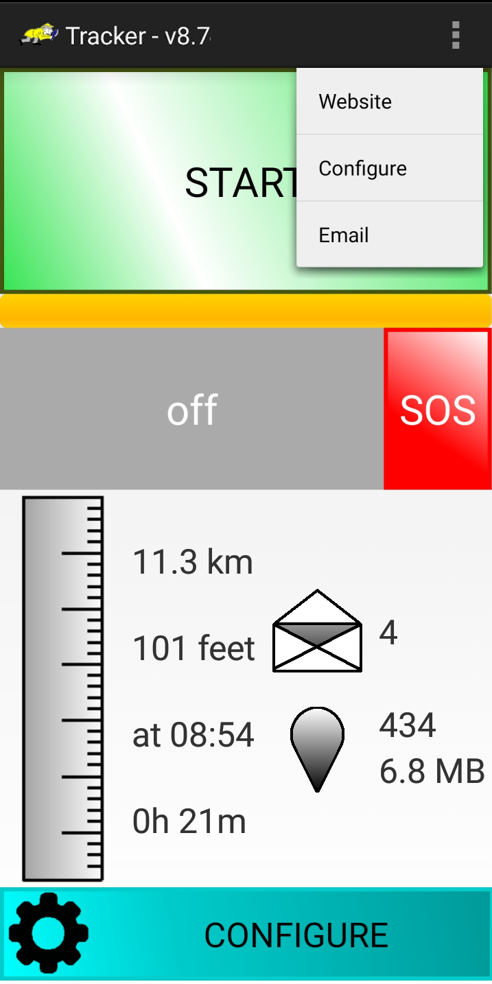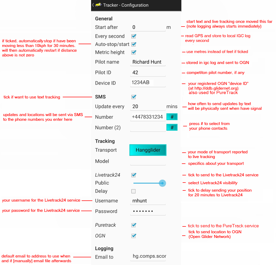 How does it work?On pressing START Tracker will start running. The button changes to STOP and a text message (SMS) is immediately sent if enabled. Your positions are recorded once you have then moved the specified distance, or immediately if set to 0m. A further text message is also sent at this moment, and then at the specified intervals thereafter. If selected, your position is also sent up to Livetrack24 and / or the Open Glider Network (e.g. view at GliderRadar.com and/or PureTrack Use the same "deviceID" for PureTrack as OGN, you can create one here If no network is present when Tracker tries to send information, it will do so when it next sees a network. Once sent, normal timing resumes. When STOP is pressed or the application exits, any changed network settings are restored. A final "stop" text message is sent for the last known position and remaining positions uploaded as soon as it is possible. The button will momentarily change to ABORT during this time before returning to START. If you are not likely to have a network for some time, you can choose to press this - but you will lose any outstanding messages and positions. Recently added, pressing the SOS button will also start tracking and send SMS to any of the selected SMS recipients you have selected (even if text tracking not currently selected). Progress is shown on screen: ![]() A single CONFIGURE button gives access to the following settings: ![]() And you can also email tracks from the main screen using the menu: ![]() |